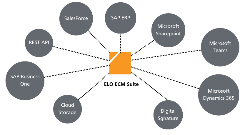 ELO ECM Suite mendukung solusi end-to-end yang dapat terintegrasi dengan peralatan maupun teknologi lain menggunakan protokol standard, sehingga memungkinkan ELO terhubung dan bertukar informasi dengan aplikasi ataupun sistem lain